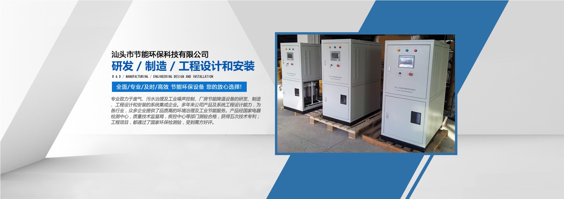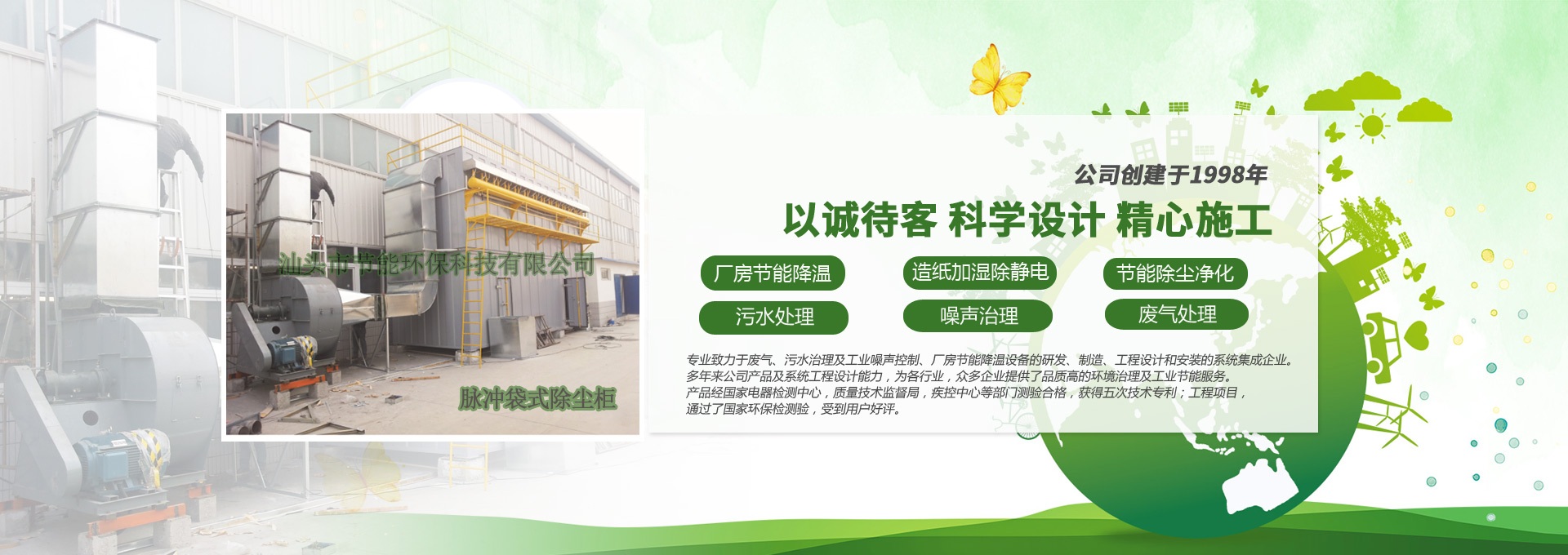 汕頭市節(jié)能環(huán)保科技有限公司創(chuàng)建于1998年,是一家專業(yè)致力于廢氣、污水、粉塵、噪聲治理,廠房節(jié)能降溫設(shè)備的研發(fā)、制造、工程設(shè)計(jì)和安裝的系統(tǒng)集成企業(yè)。多年來公司產(chǎn)品及系統(tǒng)工程設(shè)計(jì)能力,為各行業(yè),眾多企業(yè)提供了品質(zhì)高的環(huán)境治理及工業(yè)節(jié)能服務(wù)。產(chǎn)品經(jīng)國(guó)家電器檢測(cè)中心,質(zhì)量技術(shù)監(jiān)督局,疾控中心等部門測(cè)驗(yàn)合格,獲得五次技術(shù)專利;工程項(xiàng)目通過了國(guó)家環(huán)保檢驗(yàn)檢測(cè),受到用戶好評(píng)。